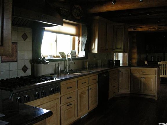 BACK ON RTHE MARKET!! $266,000 BELOW APPRAISED VALUE!! Dramatic custom log home on almost 10 acres with over 6,236 sq. ft. and a HUGE workshop with approx. 3,200 sq. ft. Walk into the amazing and stunning living room featuring massive rock fireplace, 12' log construction, exposed timber beams, vaulted ceilings with top to bottom windows giving you a full view of the scenic mountains. You will love the craftsmanship in this kitchen with tiger maple cabinets, hand scraped American cherry floors, granite countertops, and dining room with Brazilian cherry hutch. Main floor master bedroom with walk in closet, jetted tub, travertine floors, and travertine and glass block shower surround. Log staircase leads you upstairs where you will find a large study with fireplace, 3 more bedrooms, full bath with travertine floor, granite counter, polished stone basin and separate shower. Downstairs features a spacious family room with rustic maple wrap around cabinets, concrete bar, fireplace and plenty of room for entertaining. 2 more bedrooms, bathroom, and separate game, craft or music room. Oversized 2 car garage takes you inside your home to the mudroom or kitchen to drop off your groceries and YES there is a HUGE separate workshop/garage with approx. 3,200 sq. ft. with heat and electricity. Nothing but green fields and mountains in your private backyard. This is truly an amazing home and exceptional value.