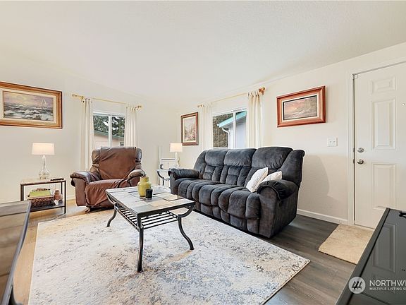 Welcome Home to this spacious newer home in Canyon Park Mobile Estates 55+ community! This open-concept home boasts a large great room w/vaulted ceilings and newer LVP plank flooring. The open kitchen with eat-in space makes entertaining easy. The king-sized primary bedroom has convenient built-in storage in the walk-in closet. The 2nd bedroom is generous in size with a full closet. The full bath is complete with newer LVP flooring and tub/shower combo. A newer washer/dryer as well as all appliances stay for the new owner. Features include: newer LVP plank flooring, newer water heater, Hardi-plank siding, and paved/sealed additional parking area. The community offers a clubhouse and RV parking. Check out stream at end of street!