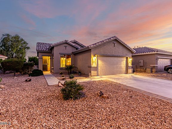 Welcome to Sundance 55+ in peaceful Buckeye—where life feels like vacation with a golf cart instead of a suitcase. This single-level gem sits on a premium lot so private no one can look in your backyard without a creepy effort. Enjoy open living with tile floors, natural light, & a granite kitchen with Cherrywood cabinets, SS appliances, & a breakfast bar perfect for morning coffee or evening laughs. The split primary suite offers dual sinks, step-in shower, & walk-in closet. A versatile den fits work or play. Outside, relax on the covered patio with pavers, putting green, & desert landscaping. Offered turnkey—lock, stock, & barrel, with all interior contents, outdoor furniture, & BBQ (minus a few personal items). Enjoy golf, clubhouse, pool, heated spa, fitness center, restaurant & FUN!