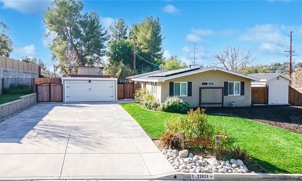 Welcome to your home sweet home! Great curve appeal. This 3 bedrooms, 2 Bath home features Remodeled Kitchen with Quartz Tile, Recessed Lighting, Newer Windows, Primary Bedroom with own Bathroom. Plantation Shutters in all Bedrooms. The Backyard has an amazing and Impressive Custom Built Covered Patio with ready for your own future Outdoor Kitchen. TV Monitor, Ceiling Fans and Outdoor Rollup Shades perfect for Summer entertaining! You will absolutely love the well maintained backyard, no need to go to the park. The spacious front and backyard with a separate stand alone Pergola for additional space seating, Gas Firepit, Side Dog Run, Shed, Central A/C, Solar Panels, Detached Garage. The humongous private backyard boasts tastefully upgraded hardscape with use of cement slabs and pebbles. There's definitely room to expand and built an ADU. The length and width of the Driveway can accommodate for RV parking and several cars. Walking distance to elementary and middle school. NO Mello Roos, NO HOA!
