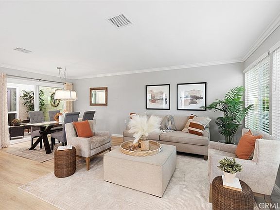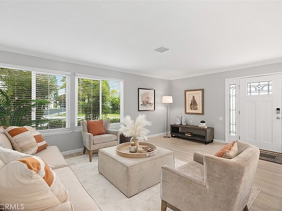 Remodeled "New Valencia" CONDO cottage - no steps and no one above or below! This popular floorplan features a huge tiled and partially covered private patio area with 2 storage closets and vinyl gated entry. Beautiful front door with leaded glass and matching side panels welcomes you to this gorgeous home. Interior features central HVAC, dual pane windows, smooth ceilings, updated crown and base molding, laminate flooring, paneled doors, updated outlets and switches plus so much more! Great room concept with spacious living room, adjacent dining space and opened kitchen updated with white shaker cabinets, granite counters, breakfast bar, stainless appliances, recessed lights and window over the sink looking to the front patio. Atrium area is protected from the sun by professionally installed, removable sun shades. Guest bedroom enjoys window looking out to the atrium and paneled floor to ceiling closet doors with organizers behind maximizing the storage space. Stack washer/dryer conveniently located in the hallway. Spa-like guest bathroom brightened by a large skylight and contains beautiful, tiled walk-in shower with glass enclosure to complement the remodeled vanity area. Stepping into the primary suite, you'll love the window looking out the patio plus a small added window above the bed to capture the morning sun! This room also features floor to ceiling closet doors and organizers. Primary en-suite houses a dual sink vanity and larger tiled walk-in shower with seat and glass enclosure. This home is move-in ready and waiting for you! Close to Clubhouse 4 to indulge your creative side at the art and craft workrooms including pottery, jewelry making, lapidary, sewing, fine art, photography and an amazing woodshop. Enjoy the free classes through Saddleback Emeritus Institute and lap swimming pool. Laguna Woods Village residents enjoy a 27-hole championship golf course, a 9-hole executive par 3 course, pickleball and tennis courts, lawn bowling, gyms, clubhouses, swimming pools, horse stables, gardening centers, artist studios, computer workrooms and classes + over 200 clubs and organizations.