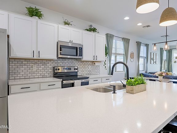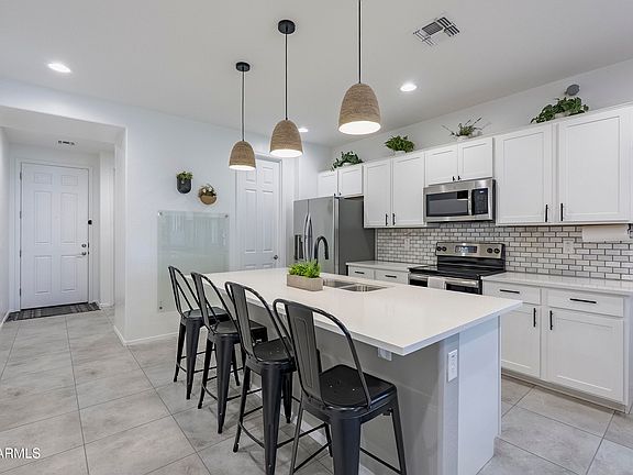 Rare 5 bed, 2 bath, 1,832 sq. ft. 1 level home with 2 car garage and cul-de-sac lot! Kitchen updates include backsplash, pendant lighting, water softener, island and granite counters. Backyard is landscaped, swing set and pavers. sun screens throughout the house, new water heater, slat board walls in entry ways, laundry room cabinets, dog door and ceiling fans in every bedroom and living spaces. Garage has service door, epoxy flooring. Community is family friendly and has community pool!