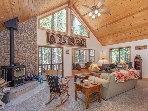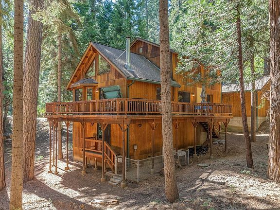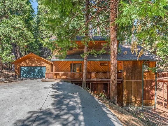 The Serenity of the Sierra Awaits! This Tri-Level Chalet located in Big Trees Village is set on .64 acres + an additional .36-acre lot to the right equaling a full acre of mountain privacy! Enter the great room with soaring knotty pine ceilings + beautiful river rock wall w/ wood burning stove (there's also forced air heat). The floor-to-ceiling windows allow for the Sierra seasons to shine through. The ample kitchen w/ stainless steel appliances boasts a double built-in oven + built-in gas stove top. The primary bedroom is located on the main level and 2 large bedrooms are located upstairs off the spacious loft. Downstairs you will find the coveted game room complete with pool table and darts. The deck is a great spot to enjoy that family BBQ! There's also a detached 2-car garage and plenty of parking. The land lends itself well for sledding, snowman building, and exploring! This gorgeous getaway is just waiting for you to start making your mountain memories!