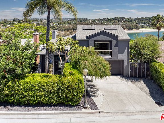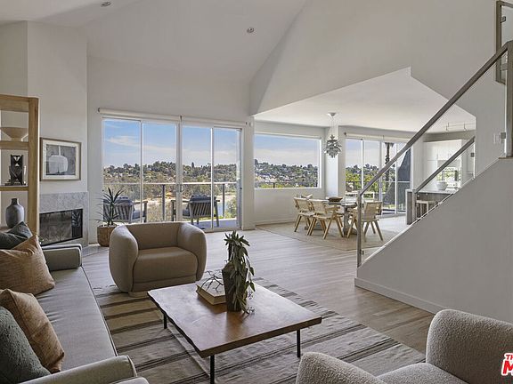 In prime Silver Lake, this radiant, updated Modern commands spectacular panoramic vistas and enjoys rare privacy within the coveted Ivanhoe Elementary boundary. Vaulted ceilings, oversized windows, and sliding doors bring in sunlight and frame striking views of the Reservoir and mountains, opening to decks for morning coffee and al fresco dinners in the glow of moonrise over the hills. Newly refinished hardwood floors with an eco-friendly European finish run throughout the expansive open-plan layout; the stylish kitchen includes stainless appliances and a Carrara marble waterfall island. Three bedrooms include a top-level primary with a sitting room, private terrace, and luxe bath with incredible sightlines. Multiple Trex decks extend the living space outdoors; the updated yard is a serene setting with ten mature fruit trees and room to add a pool. Amenities include HVAC, owned solar panels, gated access, and garage. You're just blocks from LAMILL, Broome Street, Forage, the Reservoir, and more.