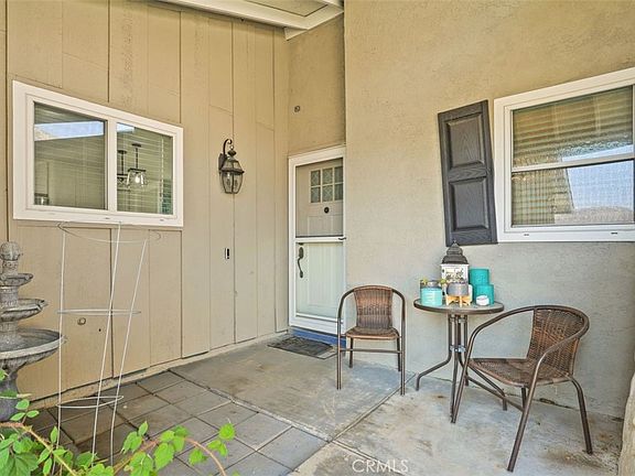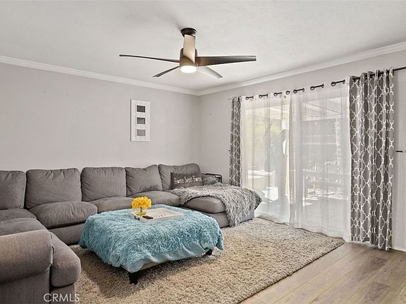 Move in ready single-story 4 bed/2 bath home in a wonderful Grand Terrace neighborhood. The interior has an open and spacious floor plan, lots of natural light, and has been highly upgraded with custom vinyl plank flooring, beautiful crown molding, and new interior paint. The remodeled custom kitchen features many updates including built-in space racks, built-in pots and pans storage, roll out pantry shelves, recessed lighting, quartz counters, subway tile backsplash, stainless steel appliances, a center island with breakfast bar seating and pendant lighting. There is also an in-kitchen dining area with a modern chandelier and a slider to the side yard. The Living Room offers a corner fireplace with custom herringbone pattern tile, a ceiling fan, and a slider to the backyard. The full-size hall bathroom has been upgraded with a quartz countertop with dual sinks. The 3 secondary bedrooms are large and the big Primary suite sits at the end of the hall and has carpet floors, a gorgeous light fixture, a slider to the backyard and a private full-size bathroom also with dual sink vanity. Enjoy the private backyard with covered patio, and there is also an attached 2-car garage. The roof is only 7 years old, and the solar system will be paid off through the sale! This home is centrally located and there are NO HOA fees and a Low Tax rate!