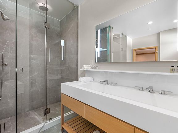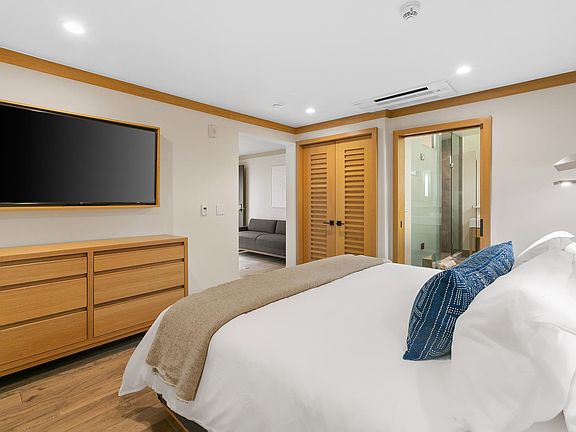 The comfortable king size bed is fully outfitted with luxurious linens and our favorite down comforter. Seamless pocket doors lead into the ensuite bathroom with a Toto Neorest 700 Dual Flush Bidet, Graff rain shower, stand alone bathtub and perfectly lit LED vanity.