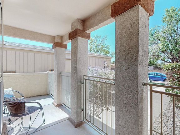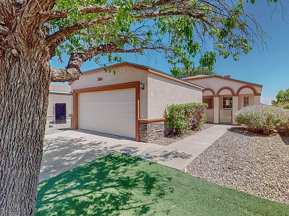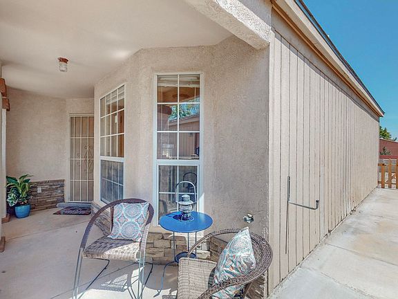 Cute as a button home now available in North Hills, Rio Rancho. Polybutylene was replaced in July of 2024 (home & yard line.) Evaporative cooler installed July 2024. Tastefully chosen fresh paint & carpet throughout. Newer stove & fridge are the highlight of the roomy eat-in kitchen. Delightfully bright sunroom at back of home makes for a cozy office space or reading nook providing a peaceful retreat. Great dog door for those pup lovers included too. Covered front patio is complemented by a flagstone facade, turf lawn (front & back), and gated entry for added appeal and security. Ideal for enjoying indoor-outdoor living in a welcoming community setting.