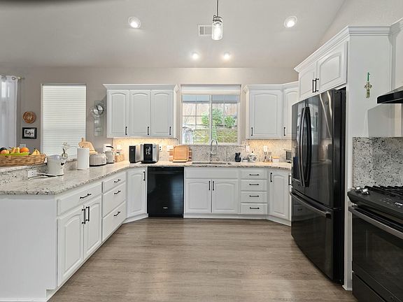 Kitchen with granite countertops & full backsplash - appliances new in 2020, freshly painted cabinets