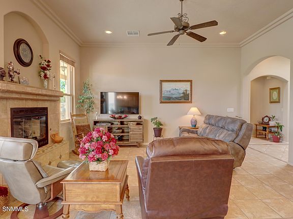 Beautiful Southwestern-style home in Sedona Hills Subdivision! Quality crafted, by prominent local builder, features a highly desired open design concept, split floor plan with 4 spacious bedrooms & 2 baths. 8'entry door leads to tiled foyer with glass block accents. Great Room features attractive tile flooring, coffered ceiling, ceiling fan & gas-log fireplace. Sunny kitchen offers plenty of counter space, large wraparound breakfast bar, wood cabinets with pullouts, crown molding, tiled backsplash, skylight and all appliances convey! Dining area with stylish chandelier & custom-built buffet. All bedrooms have newer carpet, ceiling fan & blinds. Guest bath with custom tiled shower. Primary bedroom & bath offers a tiled shower with bench, jet tub, double sinks, vanity, glass block & large walk-in closet. Upgrades include newer roof & exterior stucco, water heater, water softener, reverse osmosis, security system & more! Utility room with cabinets & utility sink. 2 car garage has shelving, door opener & ... easy access to back. East-facing backyard with extended covered patio, raised rock wall, easy-care landscaping, fire pit & raised garden bed. Call today before it's gone!