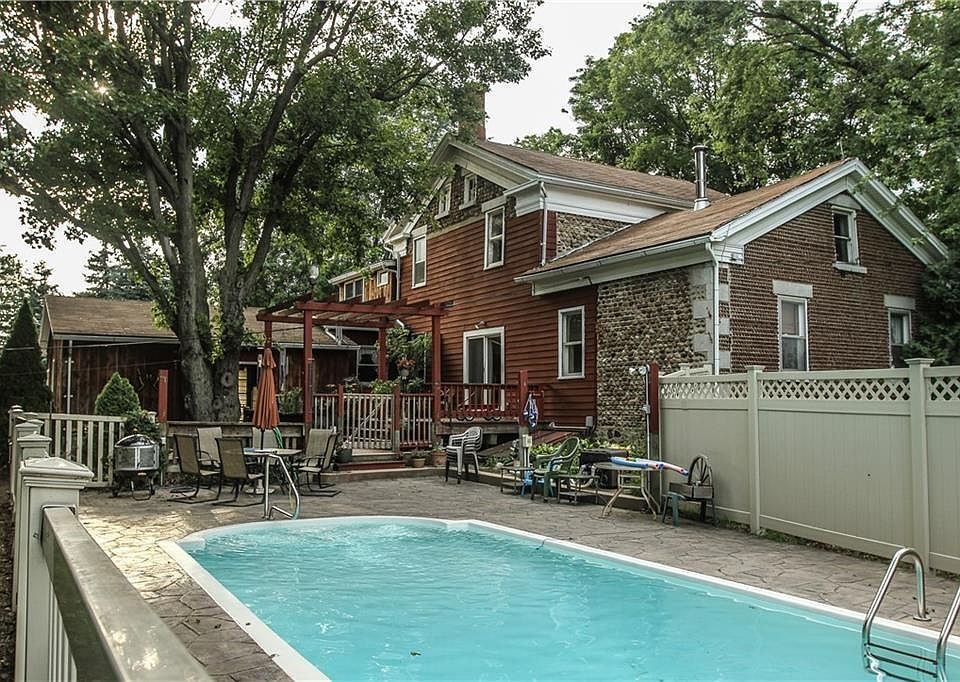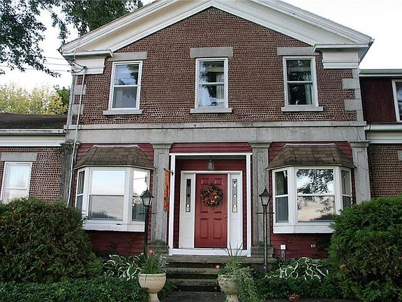 HOMESTEAD w/ 800 sqft OFFICE, GUEST HOUSE OR IN-LAW RANCH? Over 3600+ potential living space! Own a piece of history! Wonderfully set rare lake cobblestone home surrounded by mature country park-like setting on lightly traveled road. Boasting high ceilings grandeur, open farmhouse kitchen, casual & formal dining, sprawling great room & formal living room, this home has it all. Enjoy 2 wood burning stoves both recently serviced & awesome heated in-ground pool with multi-level deck/patio! 6 possible bedrooms include 2 potential 1st floor + 4 existing upstairs, including a master suite. Abundant space, even a partially finished basement! Attached 2 car garage plus a 3 story country barn! Recent architectural engineer evaluation available, updated electrical & GFIs, come take a look!