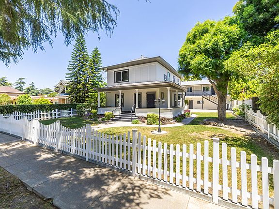 A charming white picket fence encloses the property, and a concrete walkway bordered by lush grass lawns, mature trees, and a welcoming light fixture leads you to the back building and staircase.