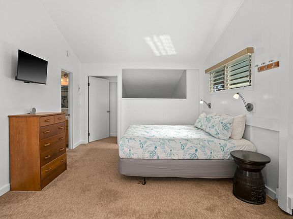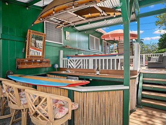 Outdoor living is a highlight with two lanais, Trex decking, a custom surf bar, and sunblock shades. Inside are Lifeproof LVP floors, a well-equipped kitchen, and new living-room furniture with a large TV. The home includes five mini-split A/C units with two condensers, providing cooling in every bedroom, the living room, and the dining area. The upper suite features a wet bar, private entrance, and ocean view (a recorded view-plane easement protects your view).