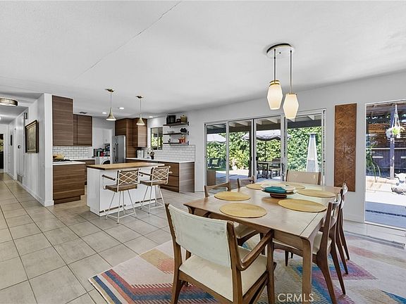 Entertain with ease in the adjoining dining and living areas, each showcasing warm textures and vintage-inspired finishes. Step outside to a private backyard retreat where California modern living comes to life. The sparkling pool is framed by tall privacy hedges and breeze block details, while multiple lounge areas—including a fire pit gathering space and covered patio—deliver a taste of Palm Springs right here in the Inland Empire.