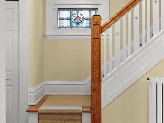 Stunning wood-burning fireplaceCustom built-in cabinetryOriginal stained-glass windowsFormal dining roomLovely architectural detailsBright kitchenGenerous private yard