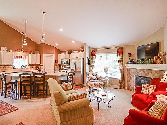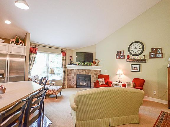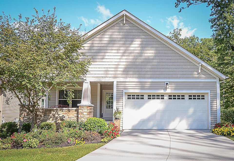 This adorable cottage-style home is nestled on the best lot in the Falling Leaf neighborhood. It sits at the end of a cul-de-sac adjacent to the 7 acre wooded preserve w/walking paths. Features wonderful outdoor living spaces with a "rocking chair" front porch surrounded by an array of flowers and lush landscaping. The home has a light-filled sunroom w/glass door leading to the concrete stamped patio & private backyard. The great room is adorned w/a cozy gas log fireplace and is open to the vaulted dining area and kitchen. The large kitchen features an expansive island with eating bar, plenty of cabinetry, & counter space. The master suite features 2 sinks, large walk-in closet, & vaulted bedroom. There is a first floor laundry, 2nd full bath, 2nd bedroom, & 2 car attached garage.