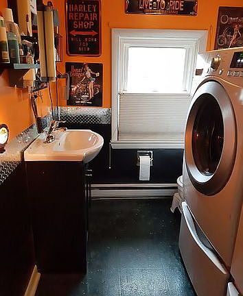 A lovely 2 story home, 3 bedroom, all upstairs, full bathroom upstairs. Living room, kitchen, dining room, walk in pantry with barn door and half bath with laundry area and a barn door downstairs. All floors down stairs are vinyl or laminate. Upstairs, 2 bedrooms are carpet. Two car garage coverted to a man cave. Both garage doors are still in working condition and can be changed back easily. It is heated and cooled.