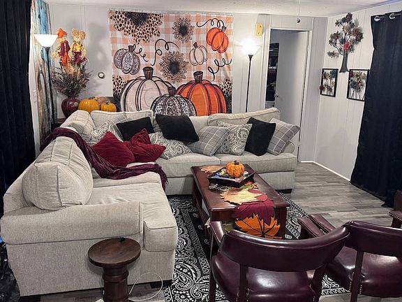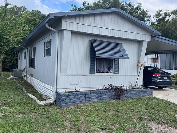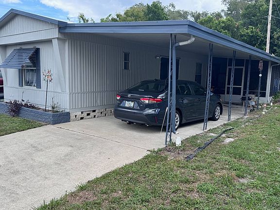 Come and see this beautiful two bedroom two bath home located in a desirable over 55 community. The spacious living room is perfect for larger furniture and a television with stand, creating a welcoming and comfortable setting. The living room flows into the kitchen which features ample counter space and plenty of cabinets for storage. The adjoining dining area offers room for a small table and chairs making it an ideal spot for daily meals. The split bedroom design provides privacy and convenience. The guest bedroom has space for a queen size bed and dresser with a guest bathroom in the hall that includes both a tub and shower. The main bedroom offers generous room for a larger queen bed and dresser along with a private bathroom that features a step in shower. Step outside into the screened room where you can relax and enjoy the fresh Florida air. Just off the screened area is a large storage shed offering plenty of extra space. The carport provides covered parking with entrances leading to both the interior of the home and the screened room. The home has a resealed metal roof, an air conditioner that is only nine years old, and new flooring throughout. This well maintained home is conveniently located near shopping, dining, and major routes to all attractions. If you are searching for a comfortable and affordable home in Florida this is an excellent choice to enjoy the relaxed lifestyle you deserve.