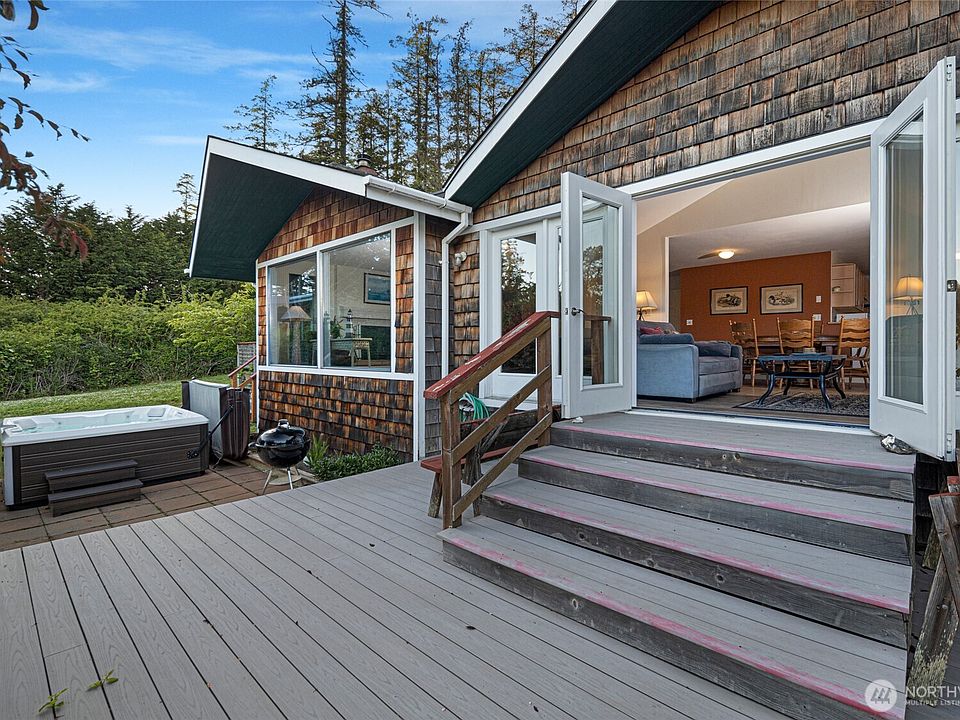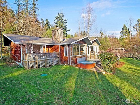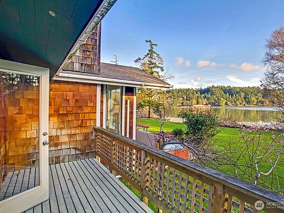 Peaceful waterfront retreat on Mitchell Bay with no-bank access for clamming, crabbing, or launching your kayak. Picture windows frame enchanting bay views, while a wood-burning stove adds cozy charm. The home offers both a living room and family room, plus a dining area with easy flow to the deck and patio. The primary suite features French doors opening to a private deck and an updated en-suite bath with oversized shower. Additional updates include new flooring and refreshed main bath. Relax in the new hot tub after a day of hiking, biking, or kayaking. Nestled in a quiet neighborhood, yet minutes to Roche Harbor Resort, marina, spa, Mount Young trails, and British camp National Park.