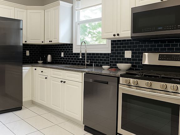Modern Kitchen: Enjoy cooking in a sleek kitchen equipped with granite countertops, stainless steel appliances, a stylish tiled backsplash, and ample cabinet space. Includes a stove range, refrigerator, and dishwasher.