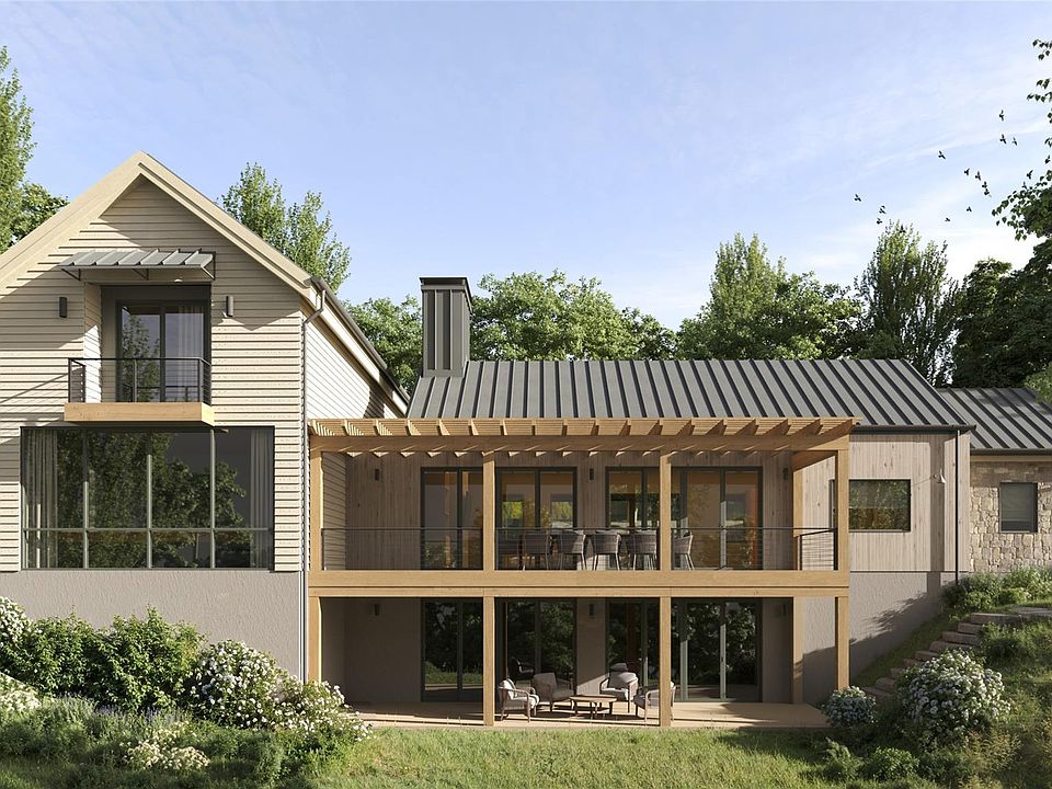 The exterior is a study in material integrity and regional character. Andersen E-Series aluminum-clad windows frame views of the forest and creek, while a standing-seam metal roof, thermally modified wood siding, and locally sourced stone from the Hudson Valley and Connecticut give the home both durability and timeless texture. A Douglas Fir timber-frame porch and exotic hardwood decking invite outdoor living, complemented by a balcony that captures sweeping views of the surrounding landscape.