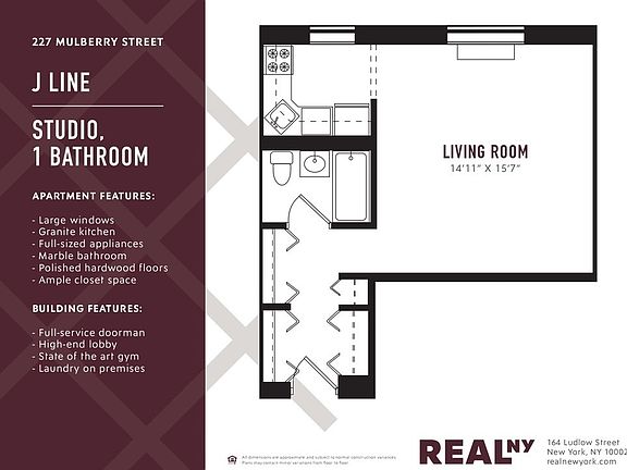 *Welcome home to 227 Mulberry the only full-service elevator/doorman rental building in Nolita!* Surrounded by some of the most celebrated restaurants and coveted boutiques in the city, the serene and sophisticated 227 Mulberry Street is right in the heart of it all. With amenities including a full-time doorman, high-end lobby, resident laundry room and Synergy Health Club in the building, you couldn't ask for much more. *The Apartment:* #2J is a large studio with *PRIVATE OUTDOOR SPACE*, an updated kitchen, marble bathroom and plenty of closet space (please see floor plan). *Available for APRIL 1ST occupancy* *Apartment features include:* - Large open layout - Common space with room for a couch and TV - Separate kitchen w/ dishwasher - Ample closet space - Marble bathroom - Private outdoor terrace! *The Building:* Located on Mulberry Street between Prince and Spring Streets, 227 Mulberry is centrally located in one of the most desirable neighborhoods in the city. Completed in 1999 to much fanfare, the building provided amenities never before seen in a rental building in the area including: - Full service 24-hour doorman - Beautiful high-end lobby - State-of-the-art gym next door - Laundry on premises - Live-in super *The Neighborhood:* Fashion-forward Nolita is one of the most sought after neighborhoods in New York City. A quick stroll around the area reveals an amazing selection of the best restaurants, art galleries, boutiques and nightlife the city has to offer. With Soho a few blocks west, the Lower East Side a few blocks east, and multiple subway lines within a two block radius, the location is unparalleled. Convenient transportation options including the 6, R, W, B, D, F and M trains are only minutes away.