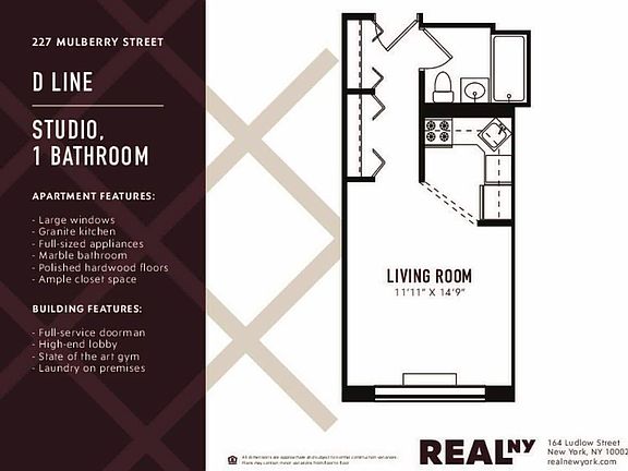Welcome home to 227 Mulberry the only full-service elevator/doorman rental building in Nolita! Surrounded by some of the most celebrated restaurants and coveted boutiques in the city, the serene and sophisticated 227 Mulberry Street is right in the heart of it all. With amenities including a full-time doorman, high-end lobby, resident laundry room and Synergy Health Club in the building, you couldn't ask for much more. *The Apartment:* #3D is a large studio with an updated kitchen, marble bathroom and plenty of closet space (please see floor plan). Available for May occupancy *Apartment features include:* - Large open layout - Common space with room for a couch and TV - Separate kitchen w/ dishwasher - Ample closet space - Marble bathroom *The Building:* Located on Mulberry Street between Prince and Spring Streets, 227 Mulberry is centrally located in one of the most desirable neighborhoods in the city. Completed in 1999 to much fanfare, the building provided amenities never before seen in a rental building in the area including: - Full service 24-hour doorman - Beautiful high-end lobby - State-of-the-art gym - Laundry on premises - Live-in super *The Neighborhood:* Fashion-forward Nolita is one of the most sought after neighborhoods in New York City. A quick stroll around the area reveals an amazing selection of the best restaurants, art galleries, boutiques and nightlife the city has to offer. With Soho a few blocks west, the Lower East Side a few blocks east, and multiple subway lines within a two block radius, the location is unparalleled. Convenient transportation options including the 6, R, W, B, D, F and M trains are only minutes away.