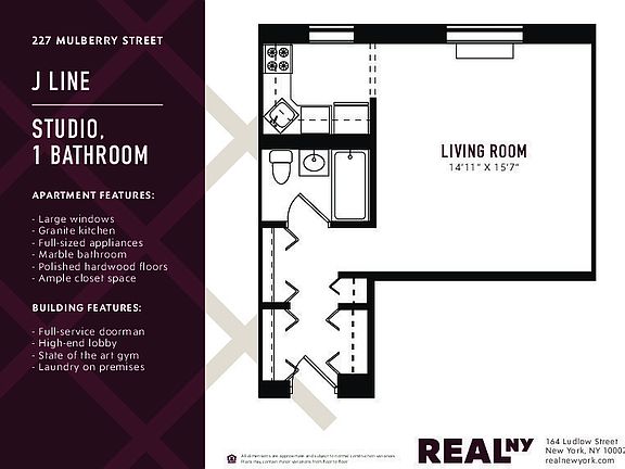 Welcome home to 227 Mulberry the only full-service elevator/doorman rental building in Nolita! Surrounded by some of the most celebrated restaurants and coveted boutiques in the city, the serene and sophisticated 227 Mulberry Street is right in the heart of it all. With amenities including a full-time doorman, high-end lobby, resident laundry room and Synergy Health Club in the building, you couldn't ask for much more. *The Apartment:* #3J is a large, open studio with an updated kitchen, marble bathroom and plenty of closet space (please see floor plan). Available for JUNE 1ST occupancy *Apartment features include:* - Large open layout - Common space with room for a couch and TV - Separate kitchen w/ dishwasher - Ample closet space - Marble bathroom *The Building:* Located on Mulberry Street between Prince and Spring Streets, 227 Mulberry is centrally located in one of the most desirable neighborhoods in the city. Completed in 1999 to much fanfare, the building provided amenities never before seen in a rental building in the area including: - Full service 24-hour doorman - Beautiful high-end lobby - State-of-the-art gym - Laundry on premises - Live-in super *The Neighborhood:* Fashion-forward Nolita is one of the most sought after neighborhoods in New York City. A quick stroll around the area reveals an amazing selection of the best restaurants, art galleries, boutiques and nightlife the city has to offer. With Soho a few blocks west, the Lower East Side a few blocks east, and multiple subway lines within a two block radius, the location is unparalleled. Convenient transportation options including the 6, R, W, B, D, F and M trains are only minutes away.