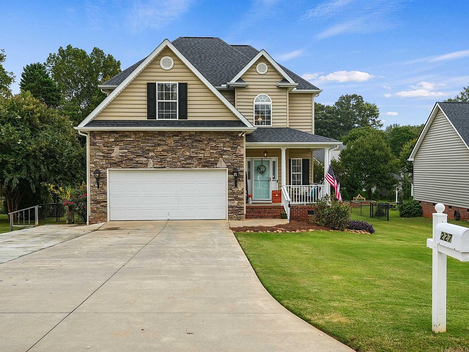 Welcome to 227 Scalybark Road—this is THE home you’ve been waiting for! Nestled just off the Swamp Rabbit Trail and minutes from Furman University, this 3-bedroom, 2.5-bath home comes packed with features from a saltwater pool to a large rec room. Step inside to a bright, inviting open floor plan with fresh neutral paint, a stone fireplace perfect for cozy fall evenings, and tall windows that flood the space with natural light. The modern kitchen boasts sleek dark countertops that pop against light cabinetry and a center island perfect for meal prep, plusa double door pantry. The primary suite upstairs is massive with trey ceilings and a spa-like bathroom featuring a soaking tub, walk-in glass shower, and dual sinks—your own private retreat! Two additional guest bedrooms share a full bath, plus there's a versatile rec room that can be your game room, home office, or playroom. But wait until you step outside! Imagine relaxing on the huge elevated deck overlooking your saltwater pool with color-changing LEDs, installed in 2020. There's a spacious concrete patio perfect for outdoor dining and entertaining, all surrounded by a privacy fence for ultimate seclusion. And there's even more yard space outside the pool area—plenty of room for pets or play! Complete with a 2-car garage featuring stone siding and charming gas lanterns, this home has great curb appeal. Only 15 minutes from the heart of Greenville, dont miss your chance to call 227 Scalybark your home!