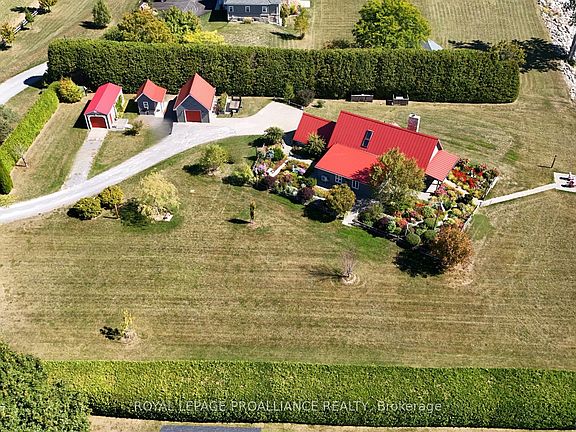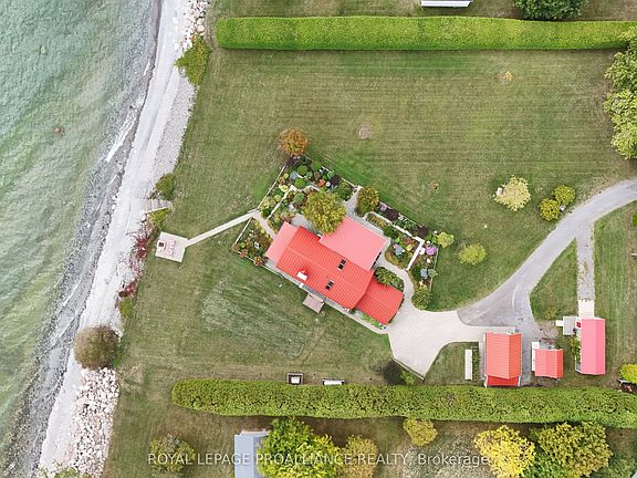 Welcome to Strawberry Lane, an exclusive collection of homes along the shores of Lake Ontario. Just East of Cobourg, 7km to the 401. You will fall in love as you meander down the private tree-lined laneway. Renovated luxury log home is a testament to timeless craftsmanship and thoughtful design. Offering the perfect blend of rustic charm and modern comfort. Meticulously landscaped 1-acre waterfront property. The heart of the original cabin immediately impresses with soaring cathedral ceilings. Rich wood flooring and a wood stove insert that anchors the living space. A charming sleeping loft with its own 4-piece bath overlooks the living area. The main-floor primary wing features cathedral ceilings, custom-built-ins, and a spa-inspired en-suite. Convenient laundry - just down the hall. Designed as both a restful retreat and a functional space. A seamless main floor addition enhances the home with natural light. The thoughtfully designed kitchen marries rustic textures with modern elegance. Featuring stone accents, wood details, and high-end appliances. Suited to both everyday living and entertaining. Outdoors, the property is a gardener's paradise, with lush perennial beds, stone walkways, and peaceful sitting areas. Several outbuildings add both charm and convenience. An enchanting artist's bunkie could provide extra sleeping accommodations for guests. Detached, insulated, heated garage and oversized storage for all the toys. At the waters edge, elevated views stretch across Lake Ontario. Meander down a gentle path to your private beach and shallow-entry swimming area. From morning coffee on the deck to summer afternoons by the water this property embraces every season. Whether envisioned as a year-round residence or a weekend retreat. This is a rare opportunity to live lakeside without compromise. A lifestyle defined by tranquility, beauty, and inspiration.
