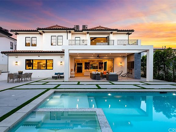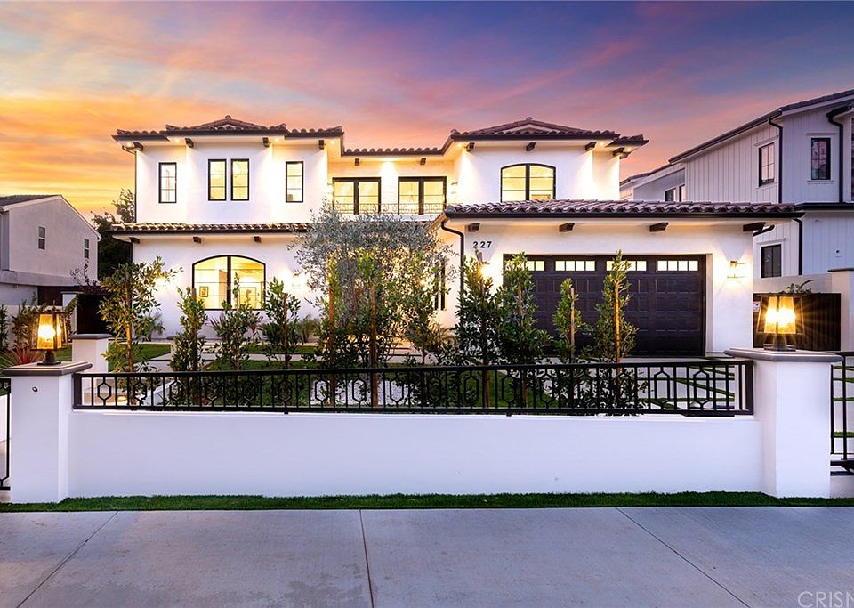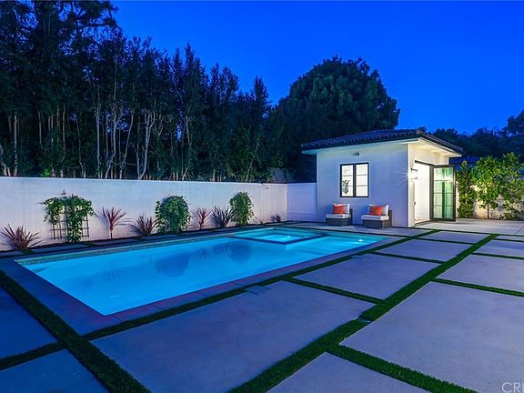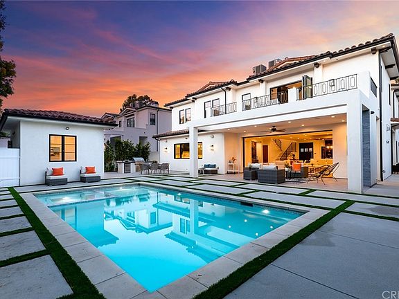 Stunning Spanish Modern Villa in the heart of Los Angeles. Past the immaculate landscaping and privacy gates, stands this stunning two-story on a 70 ft wide, nearly 9,500 sq. ft. lot, with a pool cabana. Guests are greeted by European oak wood floors, high ceilings, & luxurious finishes throughout. A wide entry hall with staircase is flanked by an elegant formal living room and dining room and a gorgeous outdoor patio. The designer kitchen boasts quartz countertops, center island with built in breakfast table & stainless appliances. An inviting family room features a beautiful fireplace, oversized pocket sliding glass doors which open up to the remarkable backyard perfect for indoor/outdoor entertaining. A downstairs en-suite completes the main floor. Upstairs, the romantic master suite showcases a fireplace, balcony overlooking the pool, and an incredible walk-in closet. The spa-like master bath offers dual vanity, soaking tub & rain shower. There is also a private balcony and spacious guest bedrooms with designer bathrooms. The private entertainer's yard presents an enclosed cabana and full bath, sparkling pool and spa perfect for relaxation and entertaining. Additional conveniences include integrated Control4 Smart Home System, security cameras & surround sound. A luxurious lifestyle close to fine dining, designer shops and more.