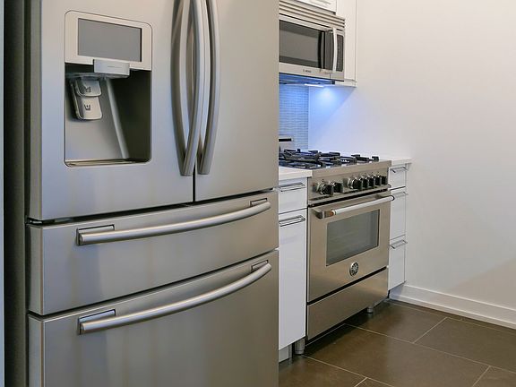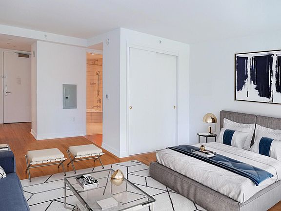 Spacious studio featuring a wall of windows, gourmet kitchen with stainless steel appliances, and stone counters, and an in-unit washer/dryer. This great home also has room for a dedicated dining or home office space and wood floors thoroughout.