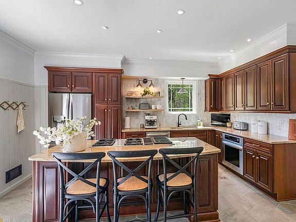 Step through the custom walnut double entry doors into a grand foyer featuring an elegant staircase flanked by a formal dining room and private study. The spacious, newly remodeled chef’s kitchen offers a Jenn-Air stovetop, marble tile backsplash, granite countertops, modern shiplap accents, brand-new stainless appliances, a bright breakfast nook, and French doors opening to a large deck with beautiful lake views—perfect for entertaining.