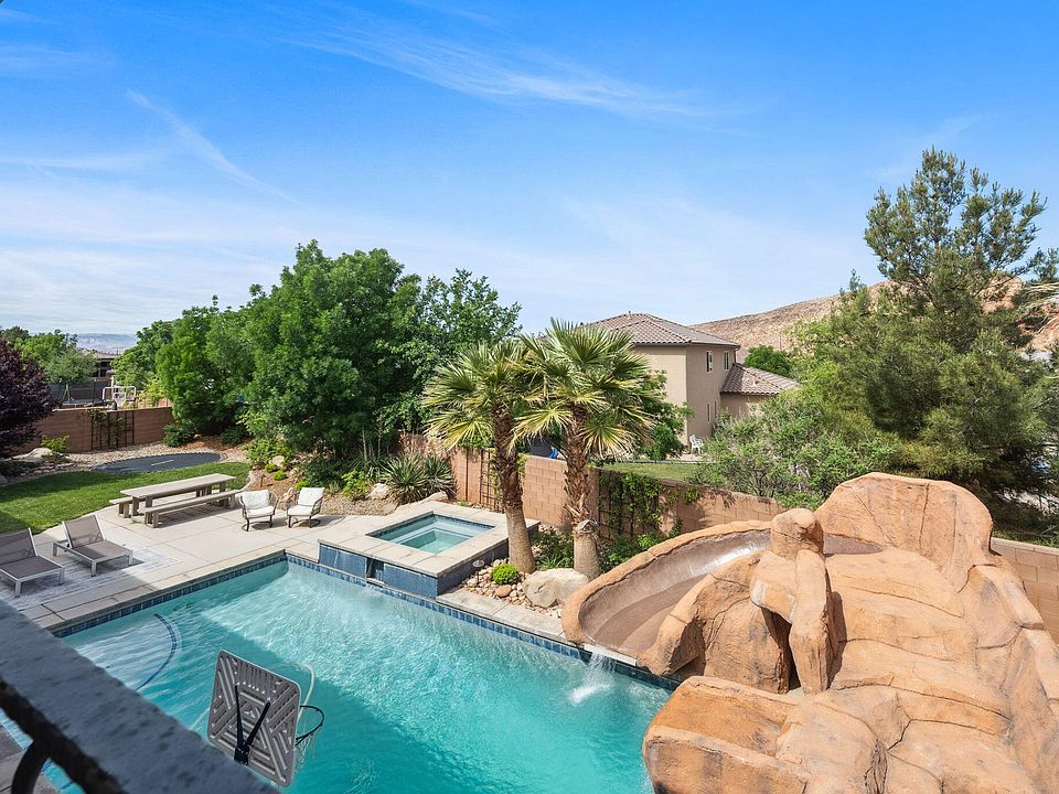 This beautifully designed property offers 6 spacious bedrooms, 4.5 bathrooms, brand new carpet throughout and an abundance of functional living spaces! On the upper level you will find 3 bedrooms, 2.5 baths, a cozy library, and stunning home office. The walkout basement features 3 additional bedrooms, each with walk in closets, including one with a private bath. On top of that, a second full bath, a full salon set up, kitchenette, storage pantry and laundry hookups make this basement ideal for hosting and relaxing. Stepping into the backyard oasis you'll find, a sparkling pool complete with a jumping rock, separate hot tub, in-ground trampoline, and a lush lawn space. A detached pool/garage storage room offers convenience for all your outdoor needs. Located in Crimson Cliffs High School and Horizon elementary boundaries, offering great academics, athletics, and extracurriculars, complete with access to the Mandarin Chinese Dual Immersion Program!