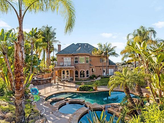 First Time on the Market. Iconic Hilltop Estate with Resort Amenities Introducing 2270 Summit Drive, a breathtaking, custom-built estate perched atop the tranquil hills of Escondido. Offered for the first time ever, this private retreat seamlessly blends timeless architecture, elevated amenities, and exceptional investment potential—all just minutes from the Pacific coastline and world-class destinations. Set on two acres of masterfully landscaped grounds, the estate’s resort-style outdoor sanctuary is designed to impress. A commercial-grade pool with a cascading waterfall, thrilling waterslide, grotto, and two separate kiddie pools provides endless entertainment and relaxation. A serene jacuzzi invites quiet evenings under the stars, while a multi-sport court perfect for basketball, tennis, or pickleball elevates the outdoor experience. Surrounding it all: lush gardens, 71 palm trees, and 21 fruit-bearing trees, framing panoramic views and a deep sense of privacy. Inside, the residence offers four spacious bedrooms, easily convertible to six, and an expansive primary suite with vaulted ceilings, private retreat space, and a dedicated workout room perfect for wellness and rejuvenation just steps from your bed. The home is richly appointed with custom finishes, generous living areas, and fluid indoor-outdoor design, perfect for entertaining or multigenerational living. Originally constructed in 2001, with a substantial addition, exterior stonework, and pool completed in 2008, this home is also fully Airbnb-ready, offering an incredible opportunity for luxury rental income or private group retreats. A car enthusiast’s dream, the estate boasts a four-car garage, plus a separate two-car garage perfectly suited for conversion into an ADU, guesthouse, or executive home office. Located just six miles from the world-renowned San Diego Zoo Safari Park and under 15 miles from the sun-soaked beaches of Carlsbad and Oceanside, this home offers the ideal balance of seclusion and coastal convenience.