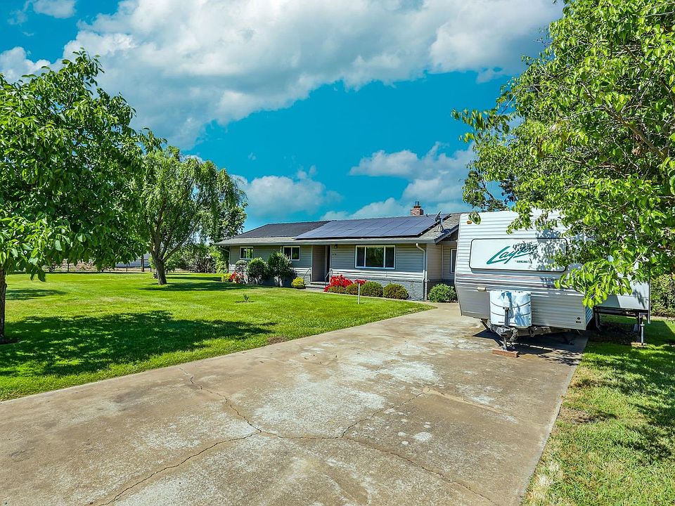 Situated on 5 Acers of usable land, this fully fenced country home is ready for you! This property is home to a solar-powered 1414 sqft, 3 bed/ 2 bath house with sunroom and 2 car garage. It features a solar heated built-in pool that is completely fenced. It is also home to a barn with an enclosed space for livestock and space for entertaining/ home office/ workshop. There is a 3 bed/ 2 bath manufactured home, with recent upgrades, included with its own address and APN; perfect for rental income or Mother-in-Law quarters. Main house has been remodeled in the last 5 years featuring newer HVAC, all new cabinetry with under cabinet lighting, granite counters throughout kitchen and bathrooms, flooring, fixtures, windows, paint, master closet, 18 insulation in attic and newer lightly used appliances including washer and dryer combo. Come view your potential new home today!