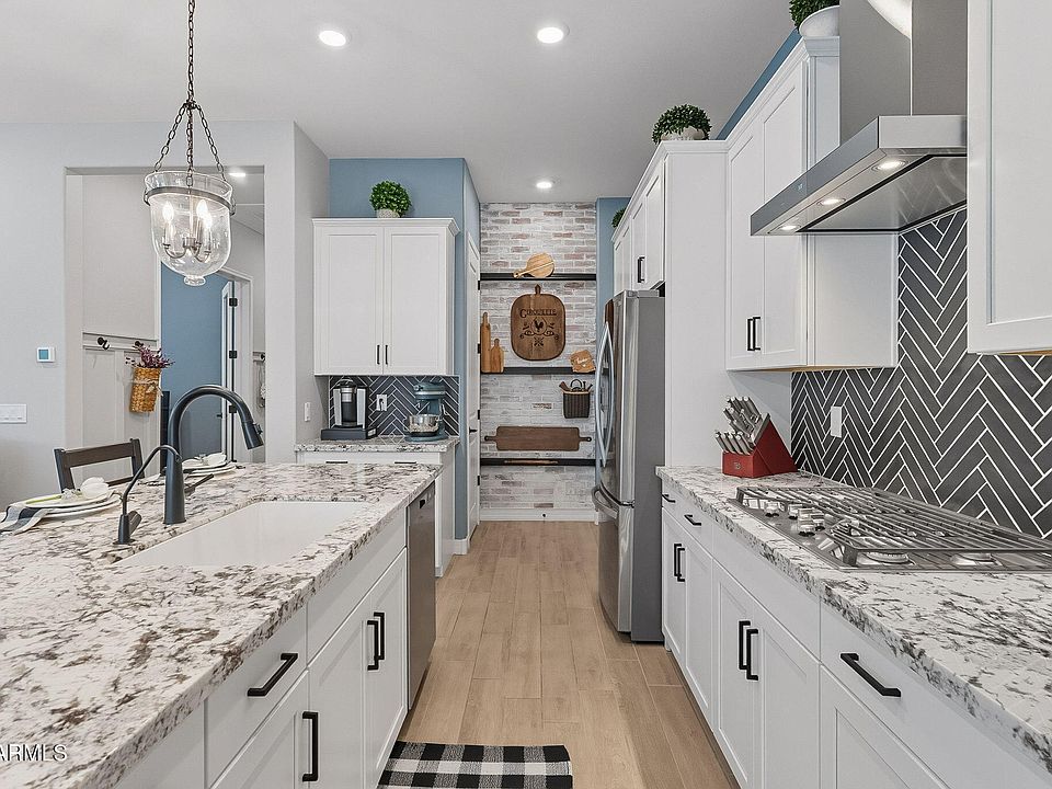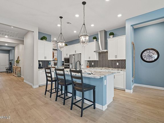 This fully upgraded Madera home offers 4 bedrooms, den, and 3 full baths. You'll love entertaining in this gourmet kitchen with stainless steel appliances, gas cooktop, custom backsplash and plenty of cabinet space. Wood-look plank tile flooring is throughout the home. French doors at the den make a perfect home office space. The 3 car garage is spotless with an epoxy finish and built in cabinets. The backyard offers turf grass and expanded stone pavers for easy maintenance. Enjoy all that the Madera community offers with quick access to east valley freeways and shopping. Book your tour today!