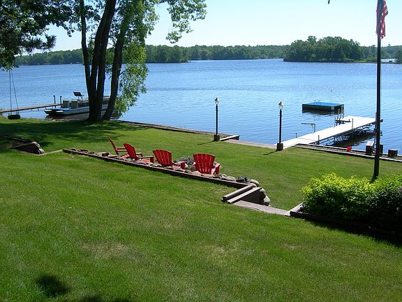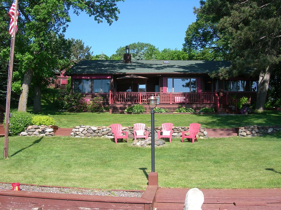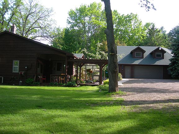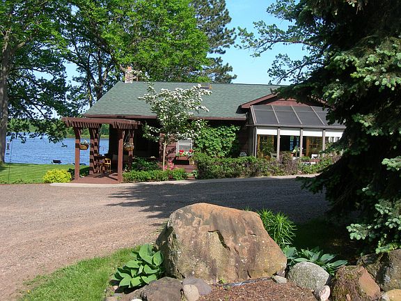 FURNISHED!. MOVE IN READY! Has all the 'I wants' in a northwoods home. 242 feet of lake frontage, open floor plan with lake views from almost every room. Fieldstone fireplace, pine throughout, glass solarium, custom cabinetry, 4 season porch off master bedroom, 872 sq ft. guest house above 3 car garage with two bedrooms, large family room, an extra room that could be made into a bathroom.
