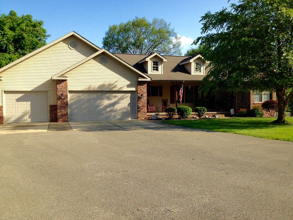 This inviting lodge style home is a beauty! 4 br, 3.5 ba, vaulted ceilings, geothermal, large deck & patio, screened in porch, 3.5 car gar, fenced back yard & plenty of side yard w/ wooded views. MBR has private door to deck, bath has walk-in shower and soaking tub. Finished walkout LL has wood plank ceilings, beautiful brick fireplace, & bar area. Plenty of space to play & entertain. Recent updates-extra kitchen cabinets, deck stairway addition, blacktop driveway, landscaping, new large shed.