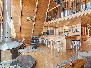 Queen & full beds in loft + queen murphy & twin roll-away on lower level, where a glass garage door opens lakeside from a cozy bar/lounge.