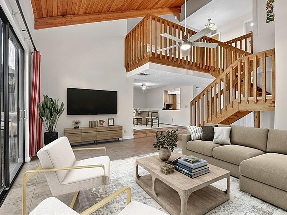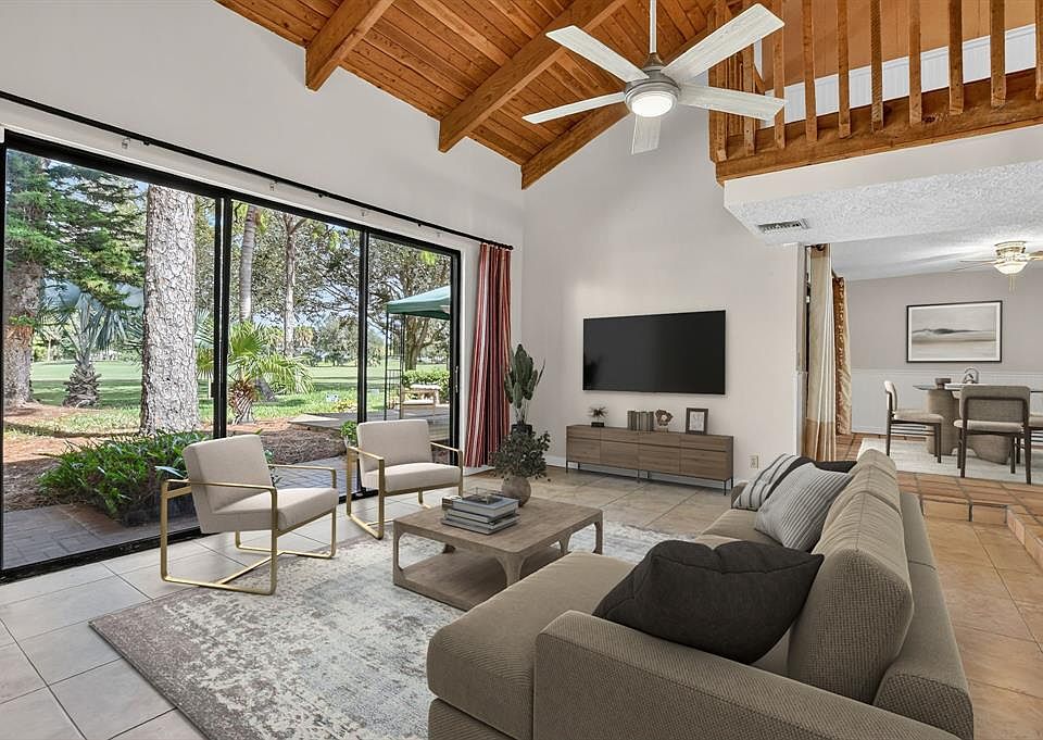 Senstional 3/2.5 TH w/ 1,800+SF. Enjoy GOLF COURSE w/ expansive views of intersecting fairways! Enter into wide-open LA w/ 20' soaring ceiling featuring wood beam finish. HUGE FR/LR w/ neutral tile has a triple slider to patio-perfect for parties! DR w/ BIG pass thru. Entertaining is a breeze in your great kitchen w/ granite counters & backsplash. Newer Maytag S/S appliances, tons of 30" cabinets + extra island! Gorgeous shiplap accent wall has IMPACT stider to fenced courtyard. Guest BR on ground floor! Beautiful rich laminate floors upstairs. Fall in love in the primary BR w/ scr balcony w/ views. UPDATED pr bath has counter ht vanity w/ granite counter. Huge tub to soak away your worries. Walk in closet-perf for fashion fan. BR w/ walk in closet. Savor coffee on the BIG DECK! LOW HOA!