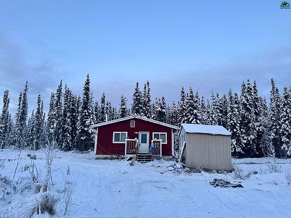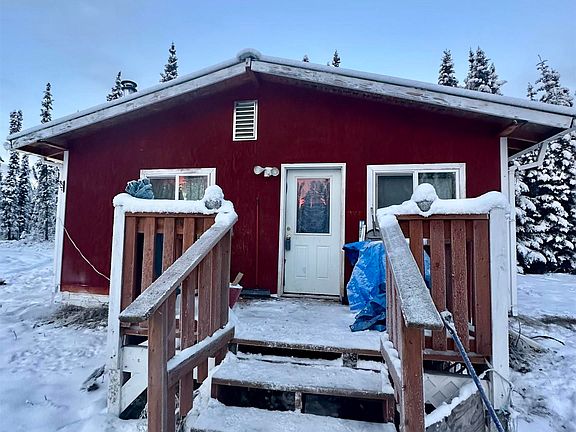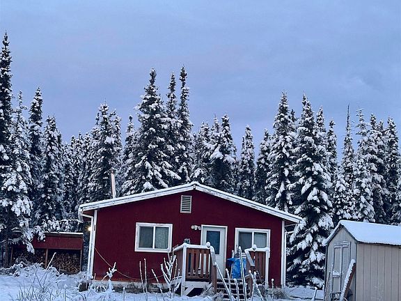 Efficient living in this ‘Damp’ cabin on 4.75 acres, set way back on the lot with private driveway in beautiful Goldstream, Alaska. Lots of open, cleared outdoor space with plenty of parking and a small pond. Composting toilet, water holding tank and greywater system.