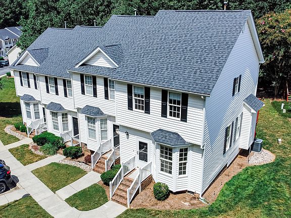 Rare 2-bedroom end unit townhome close to NC State Centennial Campus, I-40, and Downtown! This unit can serve as a long-term investment or a perfect home for those who want to be close to city or university life but with the space and amenities of townhome. A south-east facing end unit means TONS of light. Extra windows bring in light throughout the morning. Inside, you'll find a fully renovated kitchen featuring quartz countertops, an oversized sink, a tile backsplash, and modern cabinetry. The new hot water heater in 2023, new roof in 2023, and new HVAC in 2020 set you up for easy maintenance moving forward. The all REAL HARDWOOD floors make it a fantastic pet-friendly home and so easy to clean. Upstairs, each bedroom has its own private en-suite bath, offering a practical layout for roommates or professionals. The private deck backs up to a wooded area and includes a privacy screen and a locking gate, again perfect for the family pet. The gas fireplace and large open living room make it a bright but also cozy environment to relax. Plenty of storage with attic storage, exterior storage, and a large crawlspace. Two dedicated parking spaces make parking a breeze and the unit sits right in front of ample visitor parking, making it easy to host. Don't miss this one! Be close to everything without sacrificing luxuries and space.
