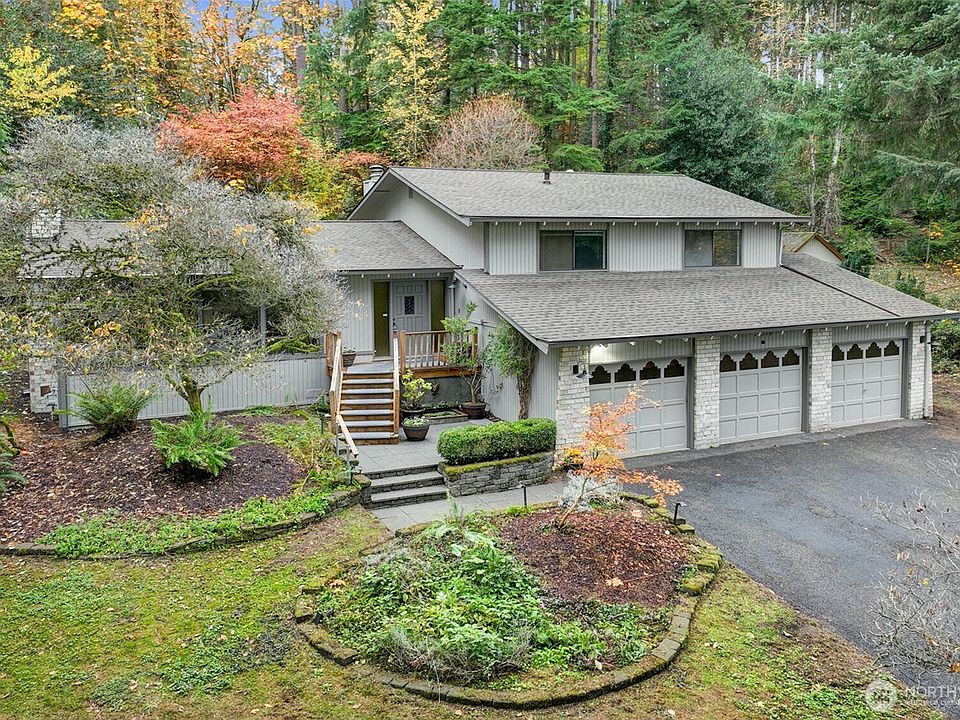 Secluded serenity minutes from everything! Enjoy this tri-level home - tucked away for peace and privacy, yet close to all your favorite amenities. Upstairs, you’ll find a spacious primary suite with ensuite bath plus two generous bedrooms and another full bath. The bright, open kitchen with sunny eating area offers plenty of space for casual meals, and the dining room opens onto a brand-new deck perfect for outdoor gatherings. The cozy living room features a gas fireplace, and the lower-level recreation room boasts a wet bar and wood-burning fireplace — the perfect spot for game nights. Outside, enjoy the peace of mind of a new roof and fresh exterior paint. Large three car garage. Expansive lot w/potential to subdivide (buyer to verify).