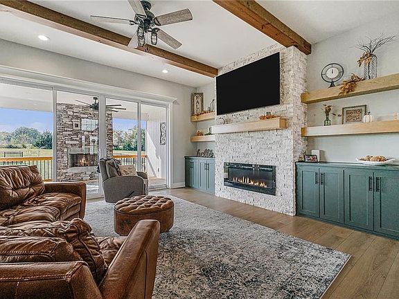 Inside, light, modern tones leading to a spacious open living, kitchen, & dining area. Living room showcases a stacked stone fireplace with custom shelving & cabinets. Chef’s kitchen boasts a grand island, custom cabinetry, gas cooktop, double ovens, farm sink, & a large pantry with beverage fridge. Step outside to a covered deck with a stone fireplace & an expanded patio that connects to the garage & driveway.