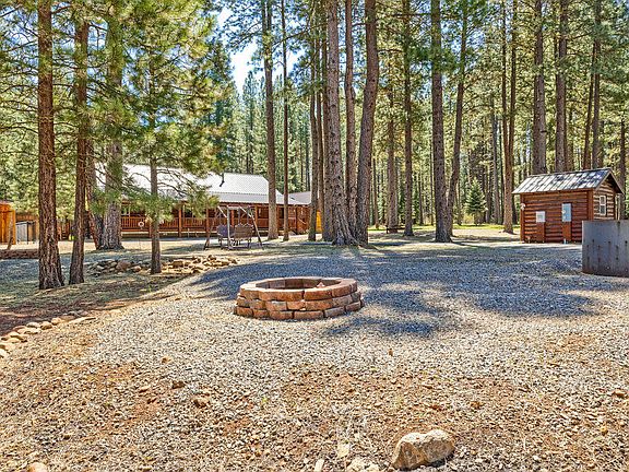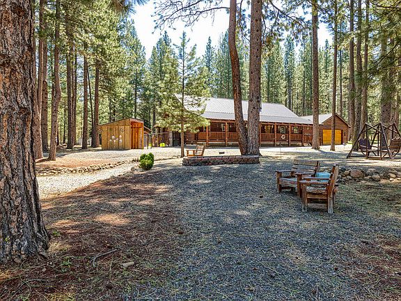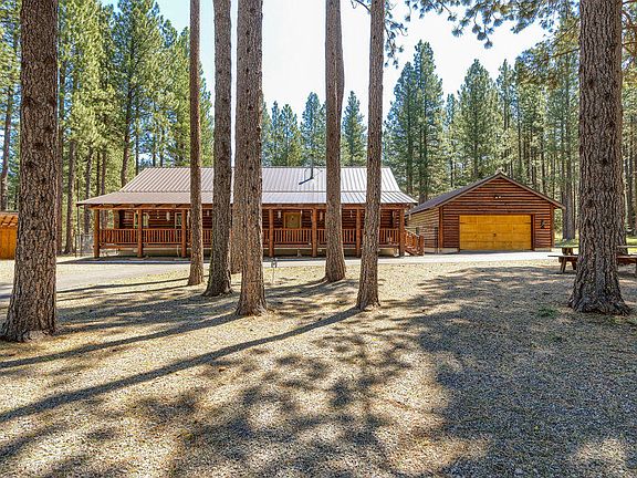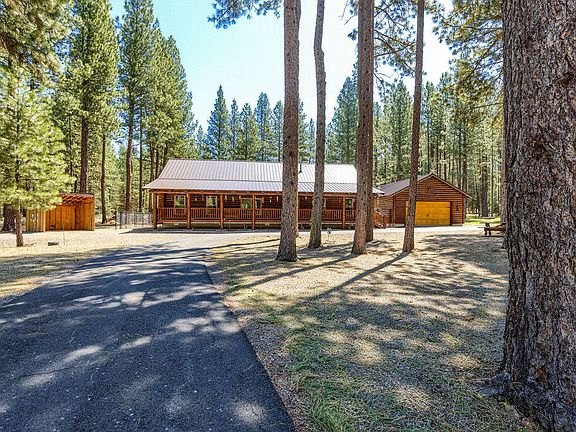 Gorgeous one owner log home & park like setting w/lg evergreens and lg circle paved driveway. Soaring log beam vaulted ceilings in all rms, lg open kitchen to great rm w/built ins & a hearthstone fireplace. All 3 bdrms are good sized! Primary suite w/ lg shower, soaking tub & walk in closet. Full length covered front & back decks with open beams. Fenced back yard that includes 3 tax lots for a total of 3 acres. 2 car garage + separate equipment garage w/shelves & work bench + hobby rm w/built in cabinets & metal roofs. Back up generator.