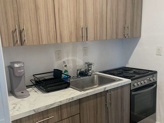 Fully equipped kitchen with a new stove, microwave, Keurig coffee maker, and refrigerator