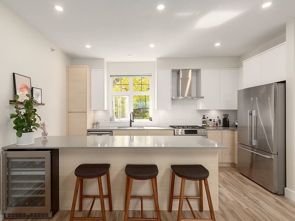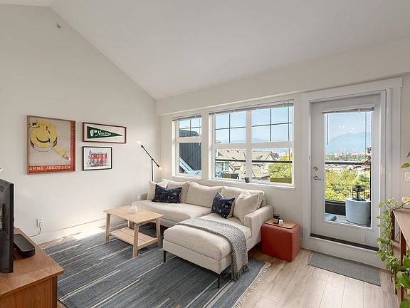 Welcome to this 2-bed, 2-bath townhome at The Vantage, a highly sought-after boutique complex in Mt. Pleasant, with unobstructed views of the North Shore mountains. The upper level is designed for entertaining with open living/dining, vaulted ceilings, and a kitchen fully redone in 2021 with Fisher & Paykel + Bosch appliances, extended island, and a gas stove. A skylight brings natural light year-round, while the patio extends the living space outdoors. On the main level, the primary bedroom offers a luxurious ensuite, along with a second bedroom, full bath, laundry, and under-stair storage. With one parking stall and two storage lockers, this turnkey home offers a perfect blend of modern living and everyday functionality. Across the street from Mt. Pleasant Elementary, and Guelph park.