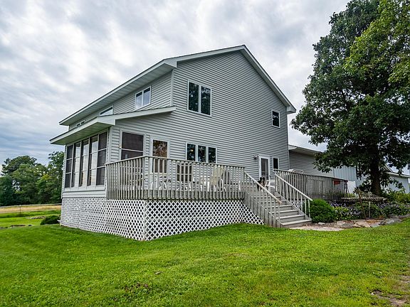 Beautiful home on 11 Absolutely beautiful home on 11 acres with additional 27 adjoining acres available (see separate listing). Includes tillable land, lots of wildlife and hunting opportunities. Enjoy the peace and quiet of country living while sitting on the large maintenance-free deck or while be surrounded by cozy knotty pine in the 3 season porch. This 3 bedroom, 2 bath home features a home security system; central air conditioning; tile and hardwood flooring; custom cabinets; custom metalwork; vaulted ceilings; fieldstone fireplace; timber framed main floor with exposed hardwood beams; play loft; Finleo steam shower unit in main floor bathroom; large upstairs bathroom that can accommodate an infrared sauna; indoor 40x20 sport court for playing racquetball, basketball, wallyballacres, maintenance free deck, 3 season porch, 3 BR 2 BA, hardwood floors, 40x20 indoor sport court, timber framed second floor with exposed hardwood beams, detached garage, outdoor wood burner. A must see!!