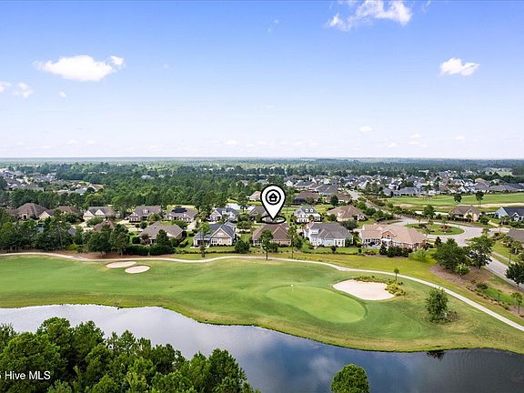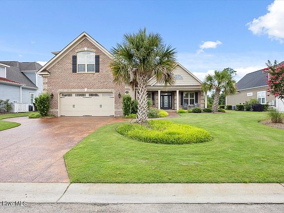 This stunning home located on the golf course in Compass Pointe is a must see! You will appreciate the level of detail in this home, starting with the curb appeal. The driveway is custom stained and the landscaping is enhanced. The front porch has a stamped concrete pattern and as you step through the front door, you will immediately notice all of the natural light and upgrades that this home offers. The living room has a vaulted coffered ceiling and is anchored by a grand fireplace and symmetrical bookcases. The open floorplan leads you the kitchen, which has ample cabinet space, gorgeous countertops, a tile backsplash, two ovens and a large double door pantry. If you enjoy entertaining, this house is perfect for that with barstool seating at the kitchen island, a spacious dining area and perhaps the best room in the house, the huge sunroom offering panoramic views of the golf course. There is no carpet on the first floor, the primary bedroom is oversized and can accommodate all of your furniture. The primary suite features two walk in closets, two vanities and a gorgeous custom tile shower. Also on the first floor, there are two more guest rooms, one is very private and the other is utilized currently as a really nice office. While no one enjoys laundry, the laundry room in this house will make it more enjoyable, there is ample storage, a sink and a large folding table. Upstairs is the huge 4th bedroom/bonus room, complete with a full bath and if you need storage, be sure to check out the walk in attic. For those of you who have hobbies, you will love the oversized garage, there is plenty of room for a work bench, storage and there is even a separate golf cart door. This house truly checks all of the boxes, come explore for yourself, and become a resident in one of the nicest communities in coastal NC. Compass Pointe residents enjoy resort style amenities including multiple pools and a lazy river, a fitness center and there is a golf course you can join.