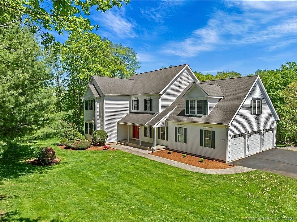 Elegant Colonial Retreat w/ In-Law Potential Nestled on 1.39 Private Acres in serene wooded setting! Nutmeg Acres subdivision is a private enclave of just 4 homes w/ a timeless blend of sophistication, comfort & flexible living. 4 spacious bedrooms, 3.1 bathrooms, 3-car garage + versatile bonus spaces perfectly suited for modern life w/ abundant privacy. Graceful architecture framed by mature trees, rolling lawn & tranquil views. Welcoming main level with flow! Entry foyer w/ 9-ft ceilings & hardwood floors that continue throughout much of the home. To the left, classic French doors open into the formal living room w/ wood-burning fireplace adding warmth & ambiance. Adjacent formal dining room, ideal for hosting holiday dinners & special occasions. Flowing from the dining room is the heart of the home: bright, eat-in kitchen & open family room! Kitchen offers granite counters, maple cabinetry, & breakfast area. Family room provides a relaxed environment for gathering, enhanced by a glass sliding door opening to your expansive wood deck spanning the length of the home. Upstairs features 4 generously sized bedrooms + two full bathrooms. Primary bedroom suite is a peaceful sanctuary w/ vaulted ceilings, hardwood floors & an abundance of natural light + spacious walk-in closet & en suite bath w/ dual vanities, jetted tub & stall shower. Offers due 5/20 at 9am 3 additional bedrooms on this level for family, guests or home office use, each w/ ample closet space & shared hall bath w/ tub/shower combo. Bonus space above garage is fully finished w/ its own full bathroom- private in-law suite or dream office? You choose! Plus expansive lower-level recreation room w/ French door walk-out access & storage galore. A private retreat ideally located w/ proximity to downtown Guilford, shopping, dining & major highways. Hydro-air heating & central air. Whether you're seeking a peaceful retreat, space to host & entertain, or multi-generational living possibilities, this home delivers it all. Come see!